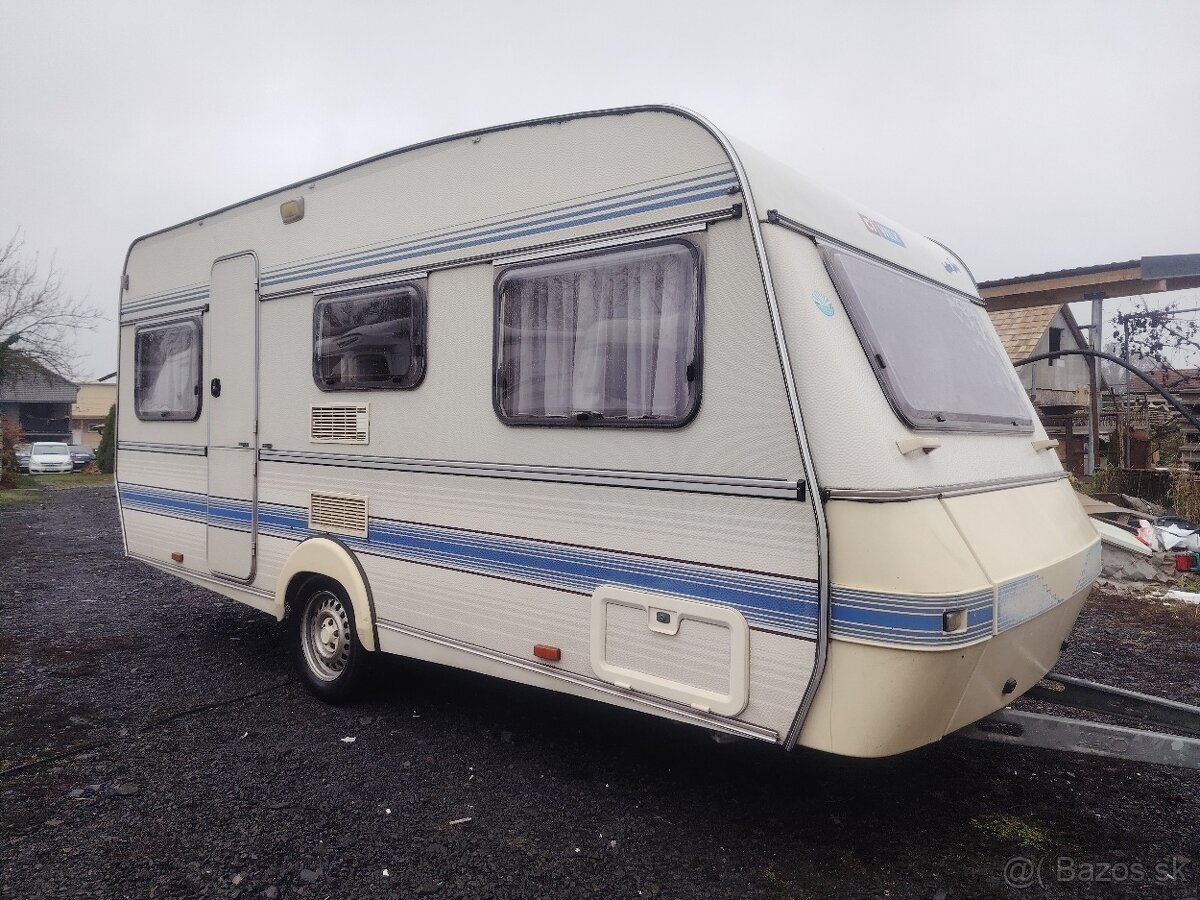 Kompaktný, kvalitný obytný príves/suchý a čistý/ aj pre štyri osoby s priečnym lôžkom/sedením v prednej časti a U sedením pri dverách.