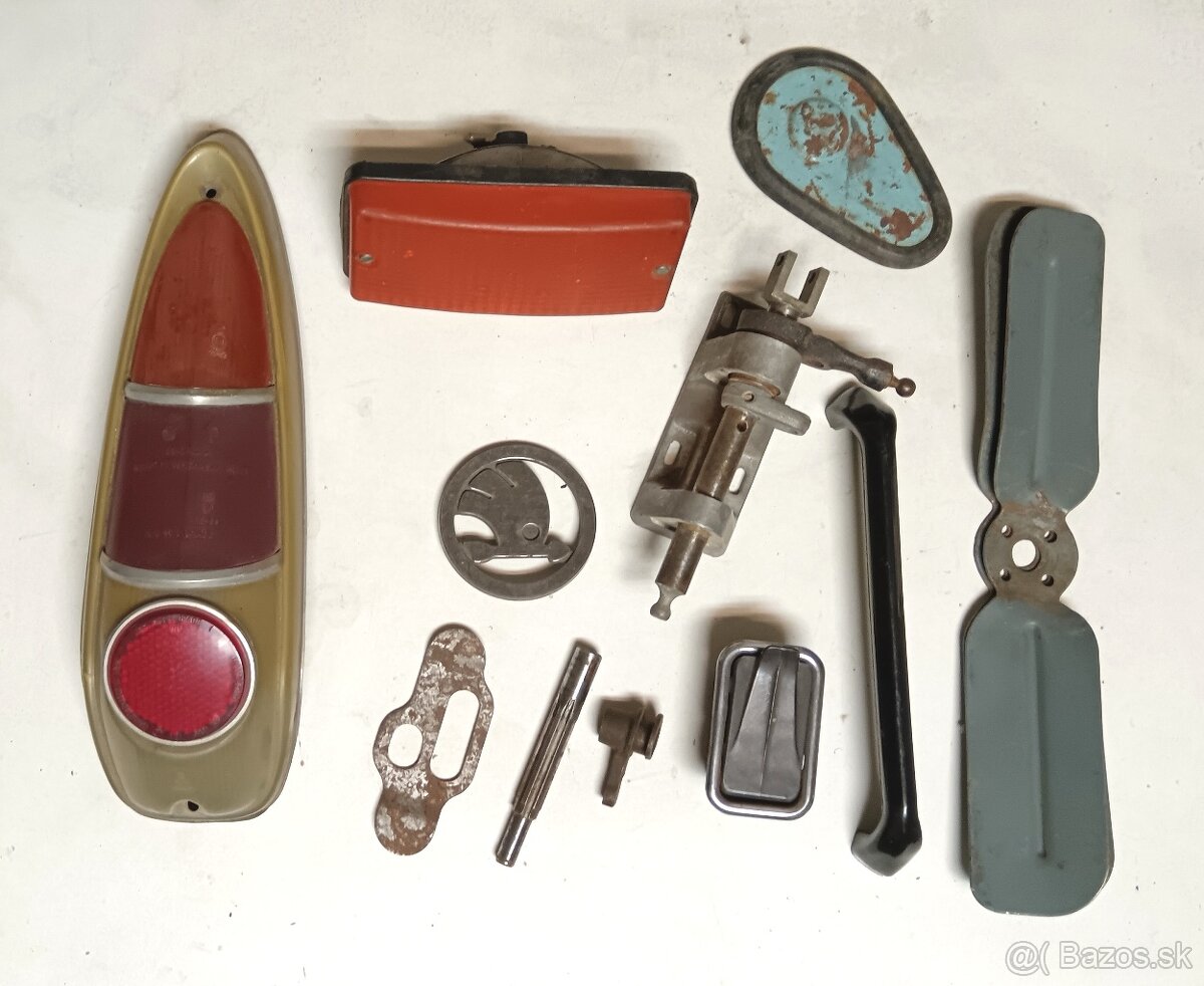Nepoužité brzdové valčeky PAL 20€ kus, rámik svetla uloženka 5€, chróm 10€ kus, 10€,výfuk originál, nepoužitý 40€, spätné zrkadlo 20€, radenie nepoužité 20€, stropné svetlo AUTOPAL Czechoslovakia 15€, ostatné dohodou.