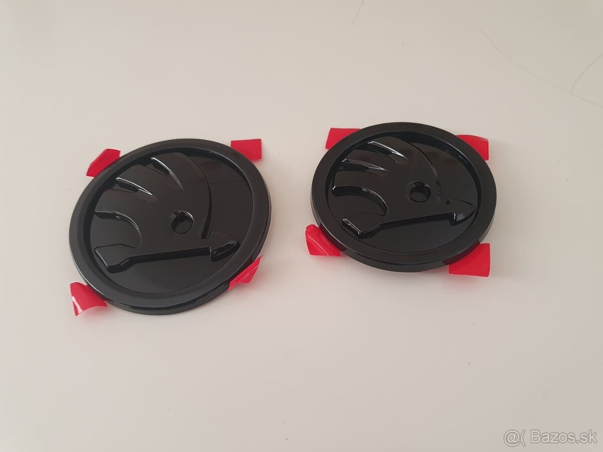 Predám tieto nové čierne lesklé škoda znaky/logá predný má šírku 90mm a zadný 80mm.