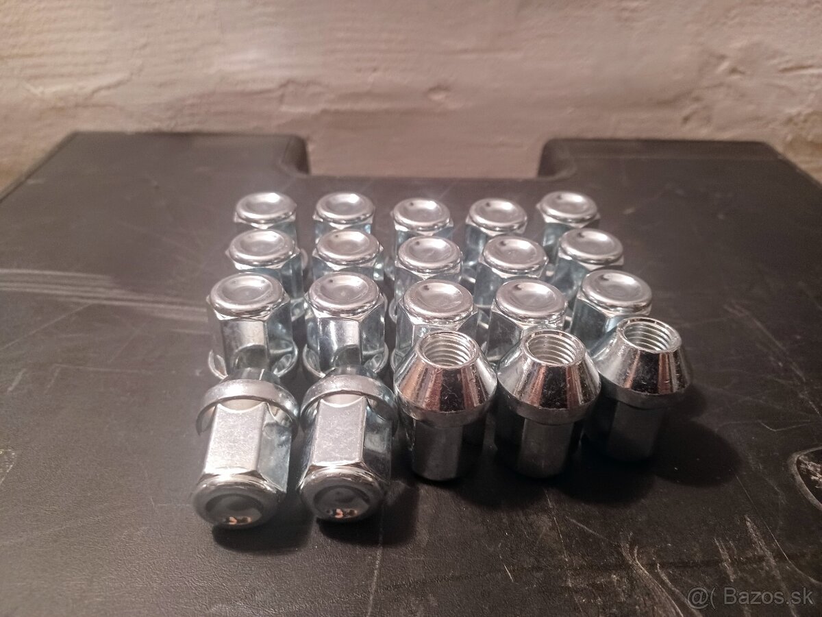 Predám 20ks úplne nových matic s kuželovou dosadaciou plochou vhodných do plechových aj ALU diskov. Závit a stúpanie je 12x1.5.