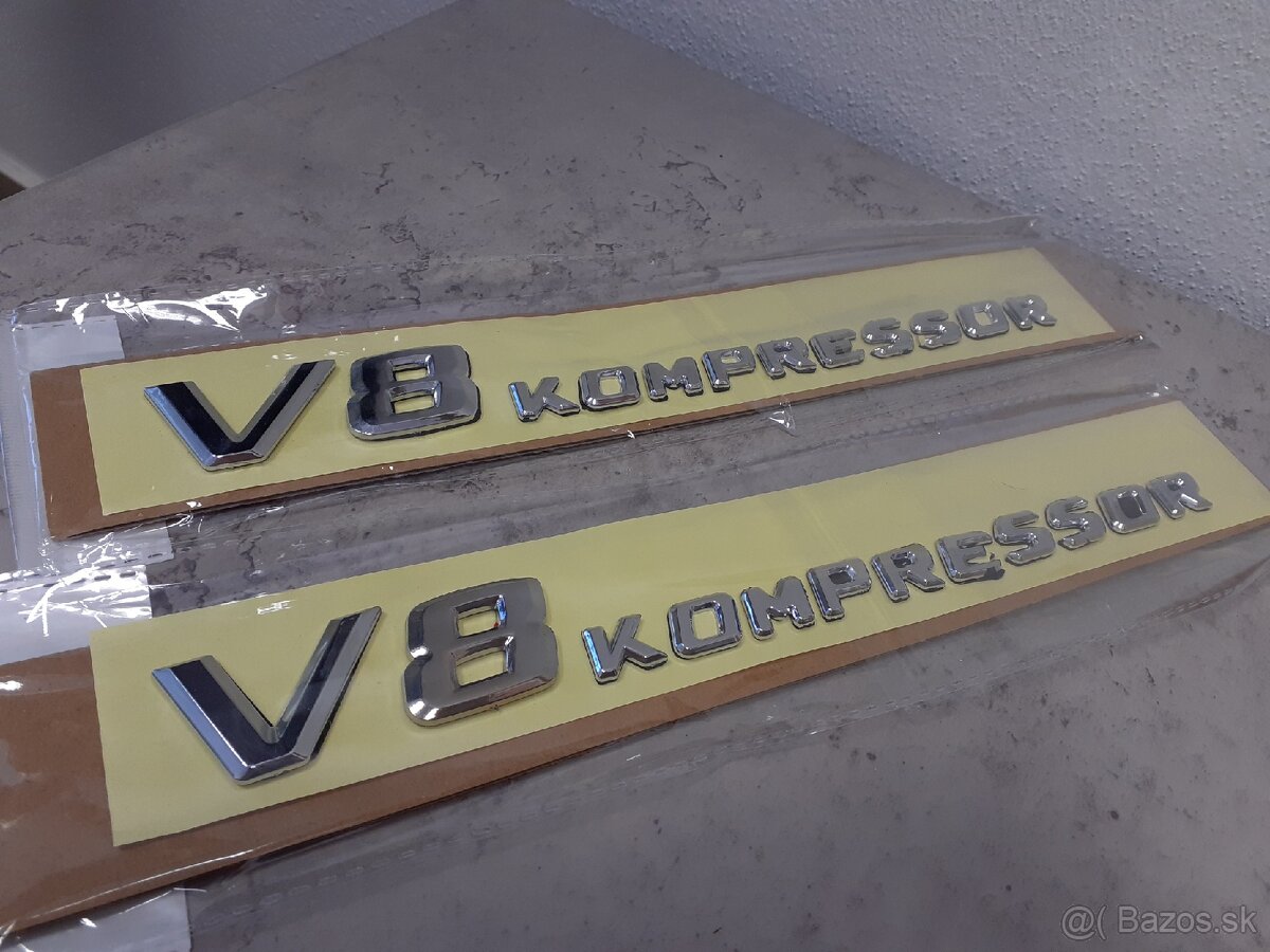 Logo / znak na bočné blatníky Mercedes V8 KOMPRESSOR, vhodné pre Mercedes SL, E , C , S , AMG, 15€ / ks.