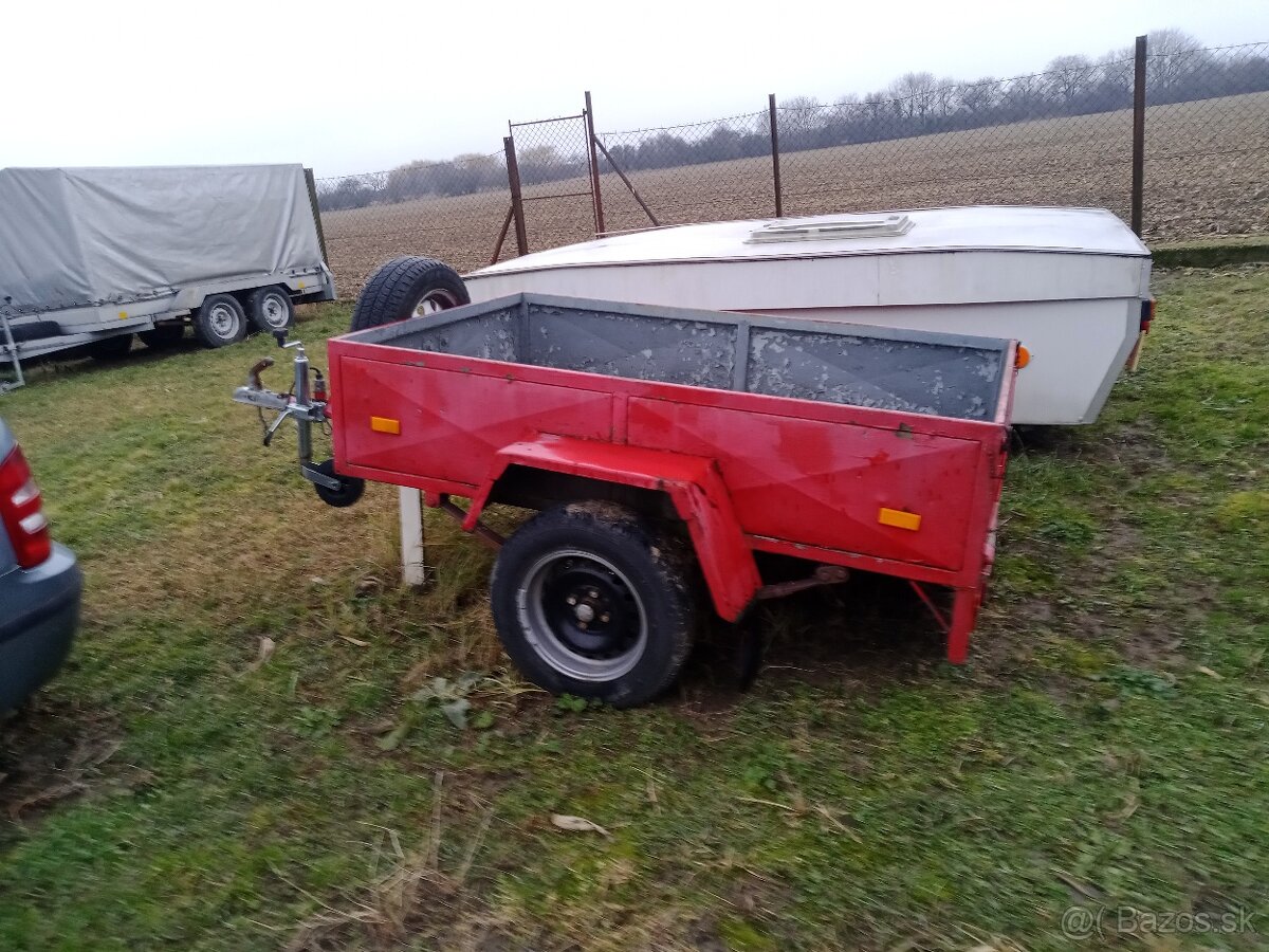 Predám príves, vlečka bez tp na nd. Červený jednoosí celokovový zváraný vlek, pevná konštrukcia za 380 €. Sivý dvojosí s plachtou za 1180 €.