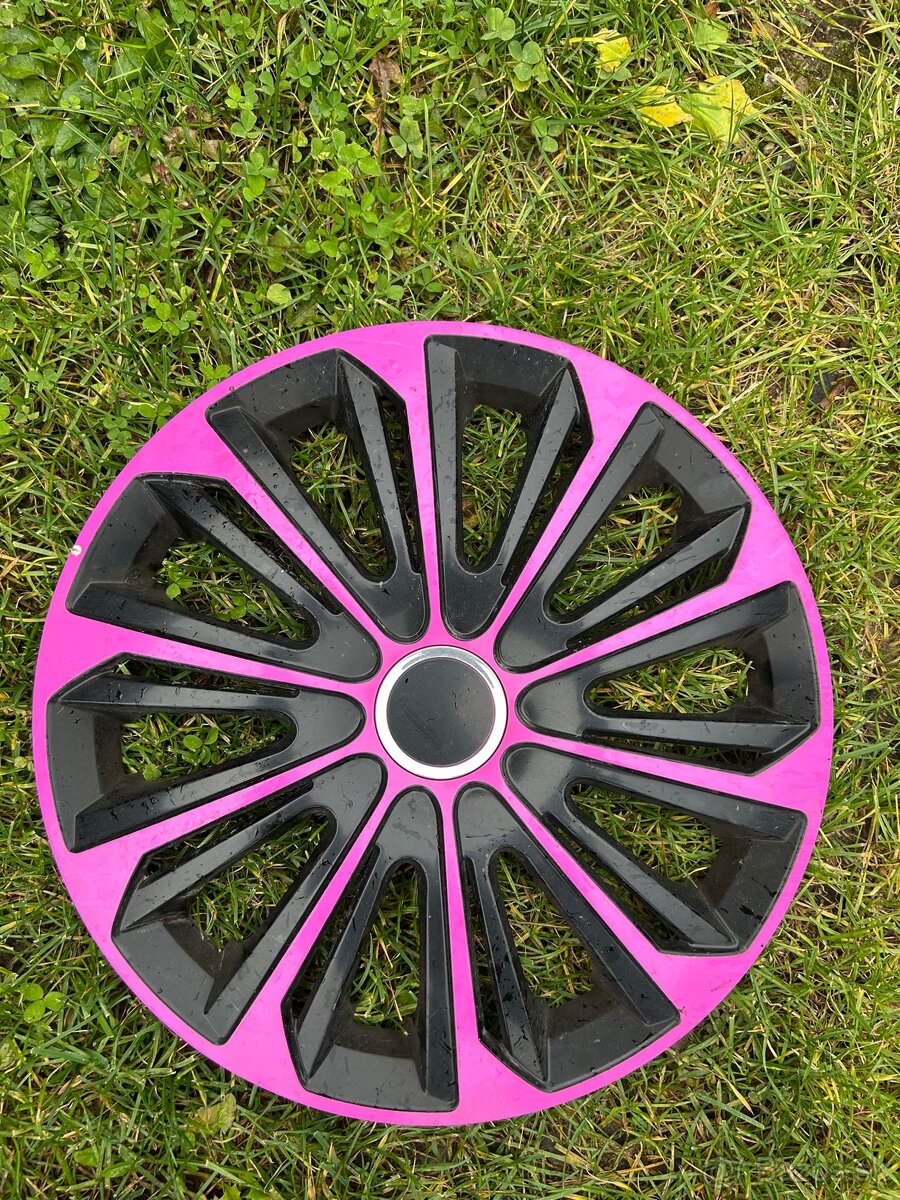 Ružové puklice na plechové disky R15 všetky štyri ako nové použité jednu sezónu