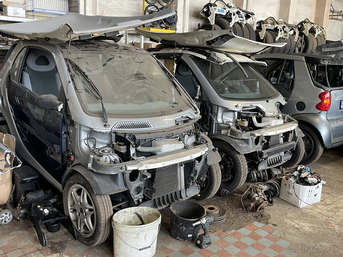 Na náhradné diely Smart Forttwo .... Motorizácia 0.6 a 0.7 benzin od roku 1998 do 2007 ... V ponuke karosárske, elektrické aj mechanické diely. Z ponuky vyberáme: motory a časti motora, prevodovku, časti interiéru, nápravy, tlmiče, pružiny, kapoty, dvere a ich súčasti, sklá, blatníky, nárazníky, svetlá, chladiče, čidlá, relátka, airbagy, časti karosérie a veľa veľa iného .