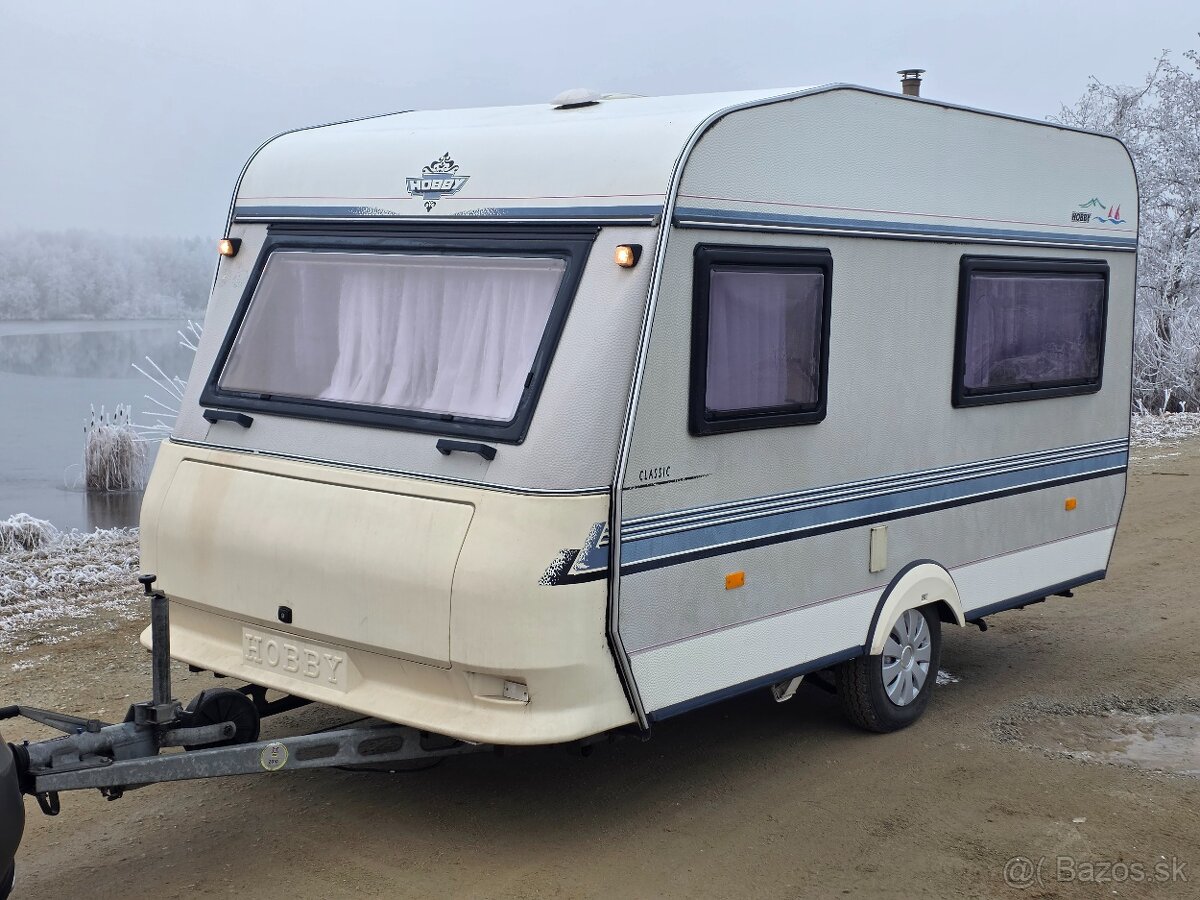Hobby 370 - Predstan, drziak na bicykle, plynove kurenie, sporak, francuzska pevna postel, rozlozitelne sedenie. Sporak.