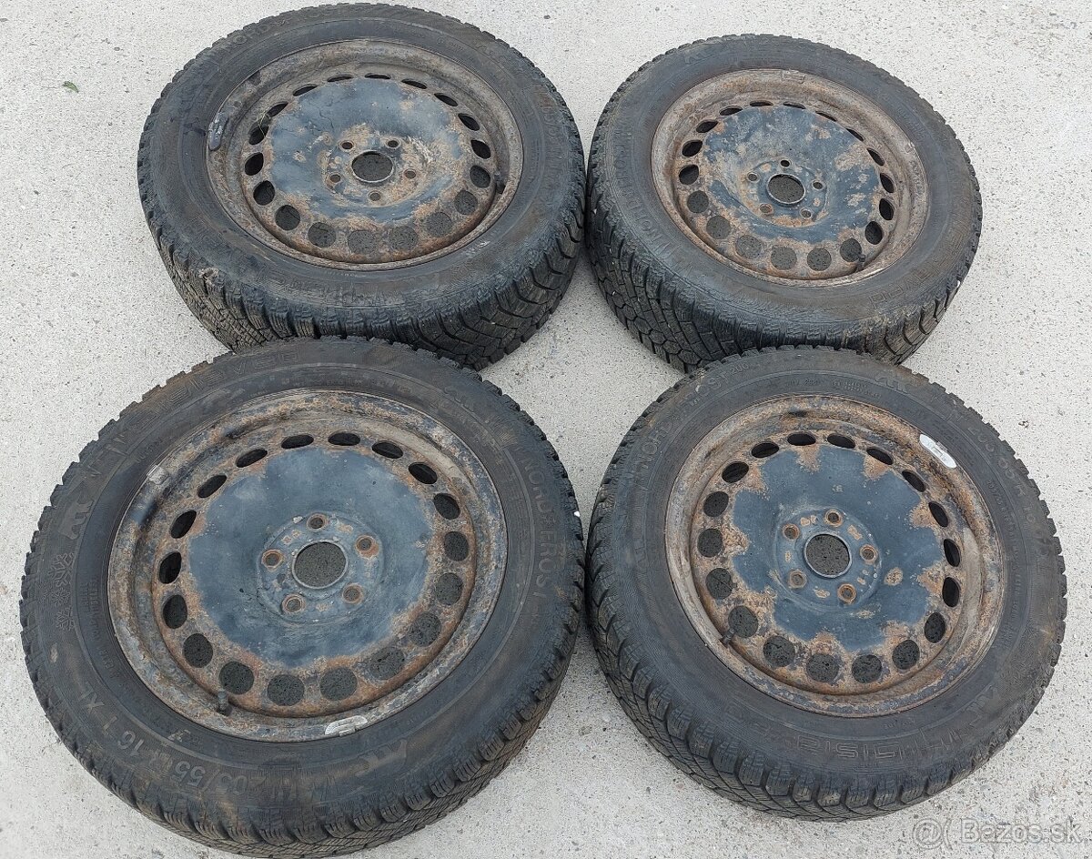 Predám plechové disky - plecháče 5x112 r16, obuté na zimných pneumatikách Gislaved NORD*FROST 205/55 r16 94T XL s dezénom ako novým a rokom výroby pneumatík 2020 - možné do nich nasadiť hroty, pasujú na autá s roztečou 5x112, najčastejšie Skoda Octavia 2, Golf 5, Audi A3, Seat Leon 1P...
