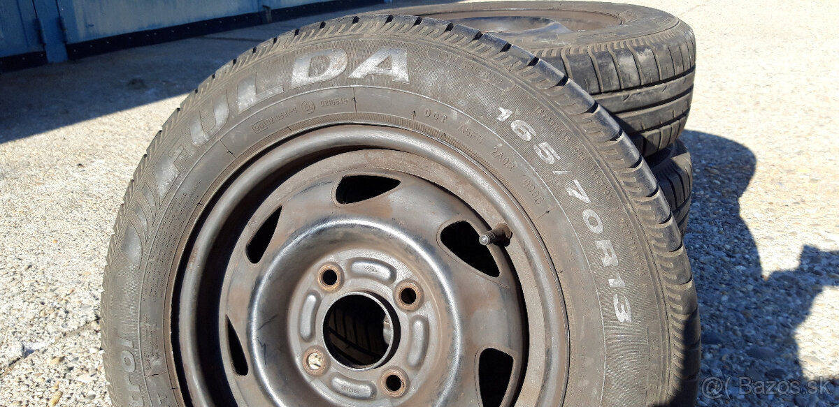 Predám staršiu sadu kolies s Letnými pneumatikami FULDA 165/70 R13, 79T, hľbka dezénu 6 mm, OC Ráfik č.9912405, rozteč 4x108 mm, Cena za sadu 100,- Euro