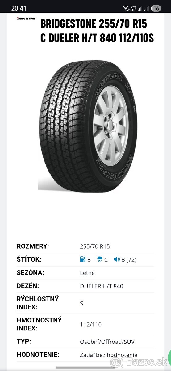 Predám 4ks ako nové pneu zosílené 255/70-R15C, M+S, Bridgestone dueler H/T 840, jazdene jedno leto, Dot1524.
