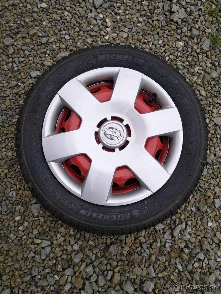 Komplet je za 270.... Sadu nových nejazdených originál plechových diskov 4 x 100 4,5 R 14 ET 35 pre CITROEN C1,PEUGEOT 108,TOYOTA AYGO od 6/14 aj na HYUNDAI + obuté nové nejazdené celoročné pneu MICHELIN CrossClimate + 165/65 R 14 83 T XL + nové puklice TOYOTA...len pneu stoja od 300 eur,možnosť len pneu za 180....