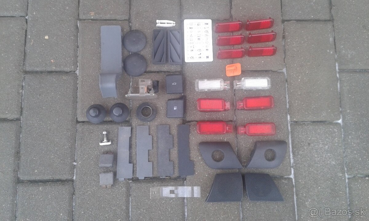 Predám nasledovné súčiastky na Škodu fabia 1:Dverové svetielka a odrazky,svetielko kufru,svetielko kastlíka,mriežky palubnej dosky,kartička s rozpisom poistiek,pinzeta na poistky,krytky predných tlmičov,plast na štítok za čelné sklo,priechodka zadného stierača,nastavovač spätného zrkadla ,krytky nastavovania spätných manuálnych zrkadiel,krytky zadných výškových reproduktorov,kontakt batérie,držiaky zásteriek,držiak tyčky prednej kapoty,plast stredového tunelu,záslepky a páčky otvorenia kufru a nádrže,krytka zadného stierača,teplomer(snímač vonkajšej teploty),mikrospínač kufrových dverí na krátku Fabiu,spínač brzdových svetiel,vnútorná zásuvka 12v,volantový airbagový káblik,zapaľovače cigariet,záslepka zásuvky na 12v,kryt zámku kufra,tiahlo otvárania prednej kapoty,kľučky sťahovania okien,trysky predných ostrekovačov,zarážka tyčky prednej kapoty,háčiky slnečných clon,svetielka osvetlenia Špz,ledka s objimkou centrálneho zamykania,kompletná nádržka ostrekovačov aj s čerpadielkom-pasuje aj na fabiu 2,polička pod rádio aj s gumennou podložkou,vonkajší plast ovládačov kúrenia a klimatizácie,elektrickú klapku vnútorného vzduchu,tiahla kúrenia,poistná matica rezervy,ovládače jasu podsvietenia prístrojovky a výšky svetiel,krytky vypínačov a vypínač ohrevu zadného okna,bočné smerovky,ľavú a pravú lištu okolo rádia,rámik okolo rádia a zásuvku 12V do kufru,kryty predných svetiel,klaksón-trúba,motorčeky ovládania predných svetiel,ľavý výškový dverový reproduktor,vnútorné spätné zrkadlo,ramienka stieračov ľavé aj pravé a mriežka predného nárazníka,vodiace lišty nárazníka-mám na starý aj na nový model,držiaky predných blatníkov,pravú vodiacu lištu zadného nárazníka,a stredové držiaky zadného nárazníka,držiak riadiacej motorovej jednotky,nádržka chladiacej sústavy,páčka otvárania prednej kapoty,kompletný stierač na Fabiu Hatchback(krátku)-mám aj na Combi,brzdové svetlo na krátku Fabiu a Sedan aj motorček zadného stierača z ostrekovačom,stropné madlá(držadlá) a elektrický zámok kufru-pasuje na Fabiu Combi aj Krátku aj Sedan,krytky strešných hagusov(hagusí)-strešných lyžin na Combi,radiace páky na starý aj faceliftový(nový) model,vnútorné chrómové kľučky,podtlakové hadičky k brzdovému posilňovaču na 1,4 MPI.Mám aj iné diely na Fabiu.
