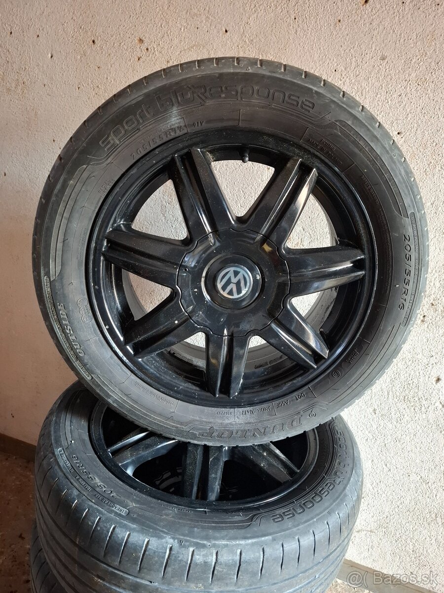 Predám alu disky 5x100 R16 s pneumatikami Dunlop 205/55R16 cca 4-5mm, ET 43, 6,5J