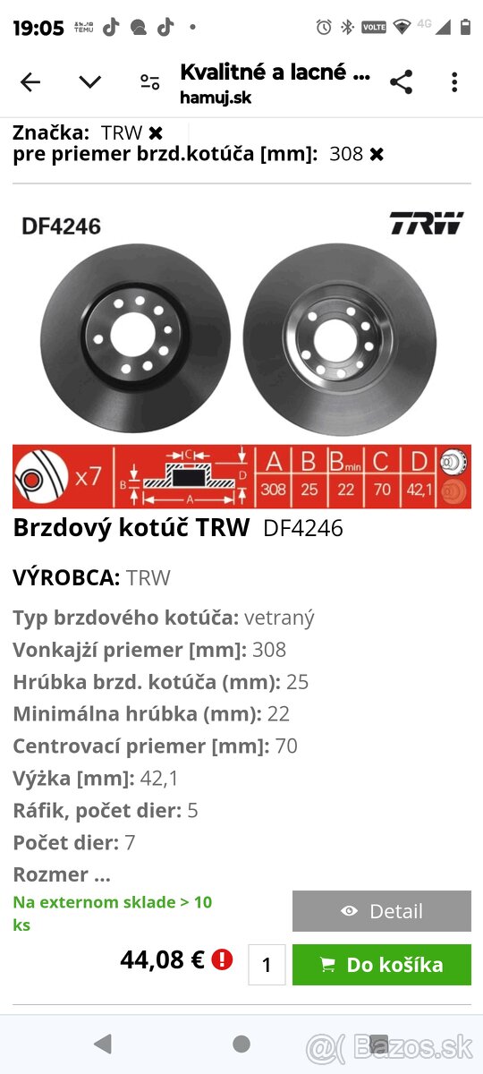 Predám 2ks no predné kotúče TRV lakované s prídavným uhlikom