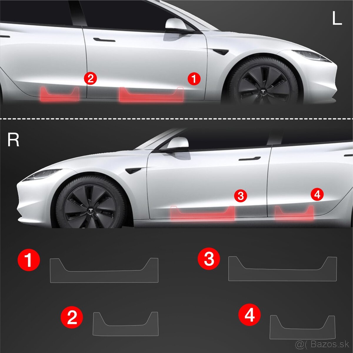 Predám ochrannú fóliu na prahy pre Tesla model 3 Highland. Obsah balenia: Fólie na prahy, Utierka z mikrovlákna SuperSoft, Čistiaci prostriedok Grizz BodyShield Cleaner, Inštalačný gél Grizz BodyShield Installer, Stierka na vytláčanie vzduchových bublín.