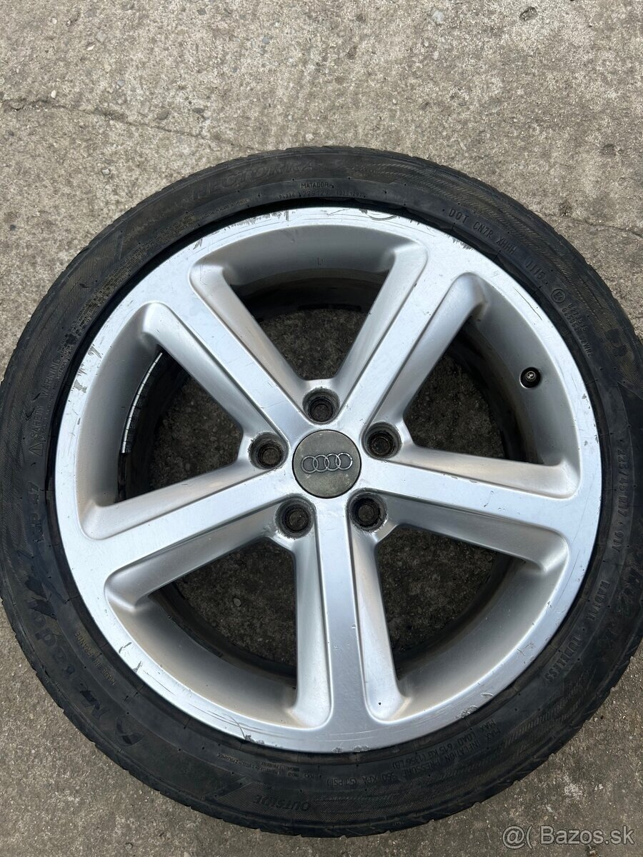 Predám kompletnú sadu krásnych alu kolies originál audi 7N0 601 025H s roztečou 5x112, ET39, 7,0Jx17 (stredová diera 57,1), s takmer letnými pneumatikami Matador Hectora 5 (DOT4922) v rozmere 225/45R17 94Y. Vhodné na Volswagen, Audi, Škoda, Seat. Cena za komplet 300€.