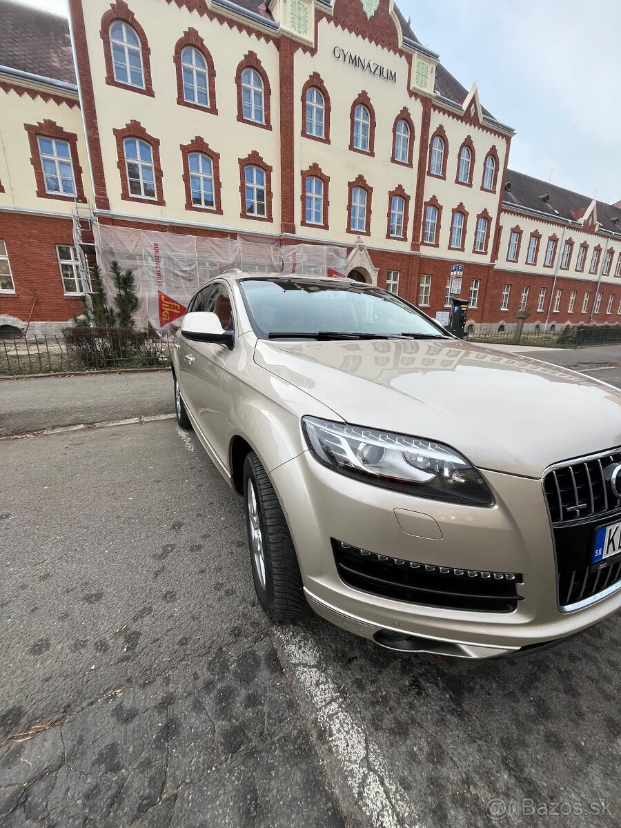 PREDÁM veľmi dobre udržiavané a garáž, zlatej metalízy,nehavar. AUDI Q7 3. 0 TDI na Slovensku kupované r. 2013 u autorizovaneho predajcu AUDI. Šetrne zabehnuté na dlhé vzdialenosti po európskych ďiaľniciach a udržiavané - servisované v autorizovaných servisoch Audi do 125 000 km, vrátane výmeny predných a zadných brzdových systémov a autobatérie. Vozidlo je netradične natipované od výrobcu so svetlým koženým interiérom a svetlým alcantar. čalúnením dverí s ambientným osvetlením lesklým tmavým dreveným dekorom a hliníkovými lištami.