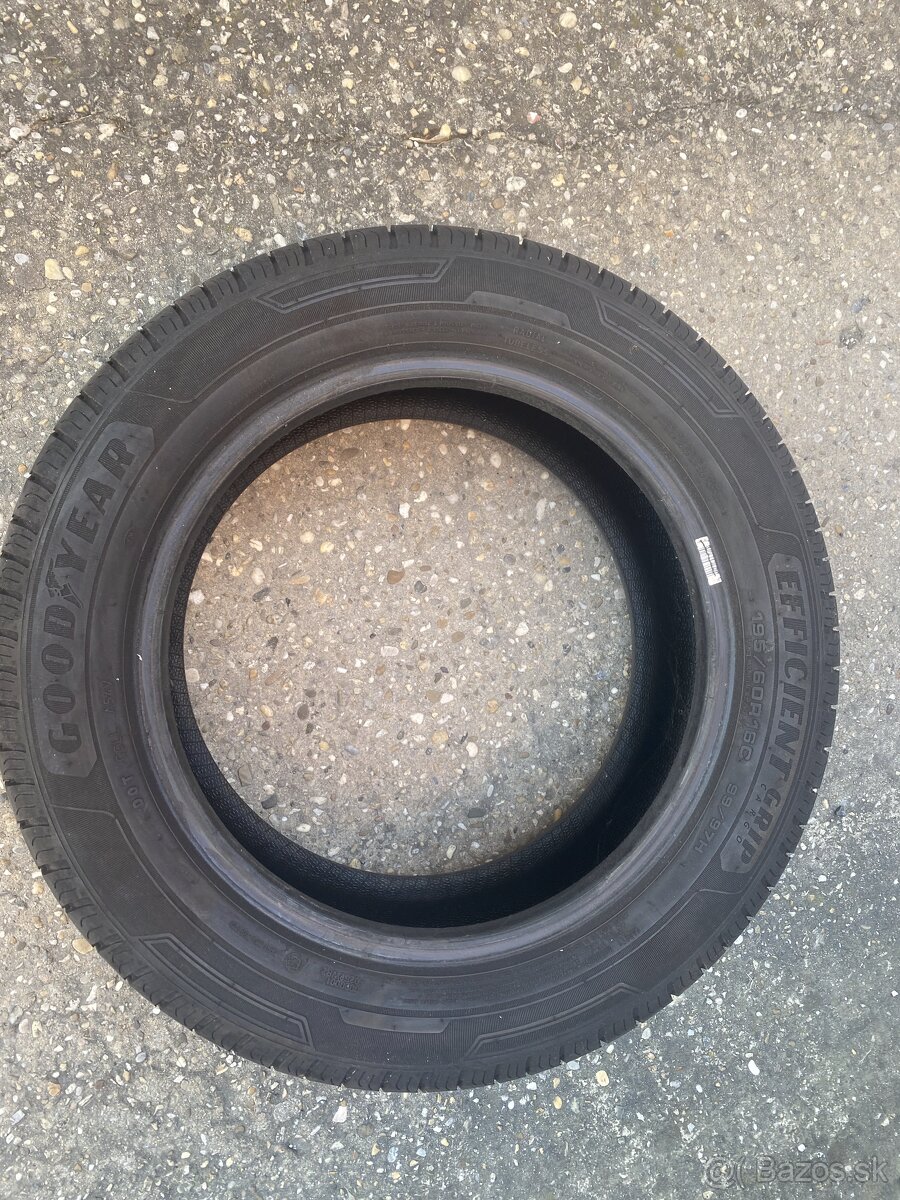 Predám letné vysokozáťažové pneumatiky GOODYEAR EFFICIENT GRIP 195/60 R16C 99/97H. Pneumatiky boli jazdené pred zimou necelé 2 mesiace (cca 2.500 km), dezén prakticky nie je zjazdený (hĺbka dezénu viď foto). Cena 60,-EUR/kus (cena novej pneumatiky je 130,-EUR). Predaj len celej sady spolu - 5 ks. Len osobný odber v Bratislave.