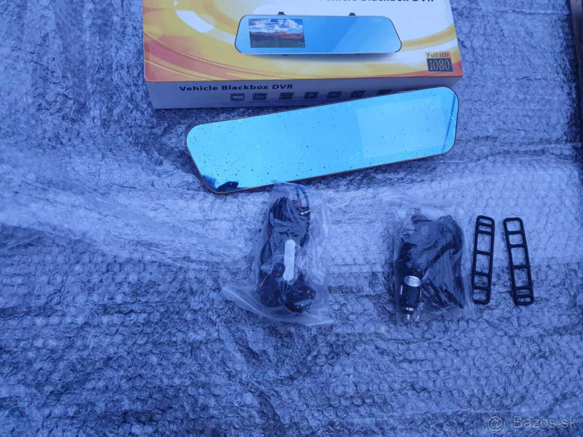 12V predna a zadna cuvacia kamera v spätnom zrkadle s LCD displejom, zrkadlo je vybavené prednou aj zadnou HD kamerou s možnosťou nahrávania záznamu, detekcia pohybu, nabíjačka do auta, kabeláž.