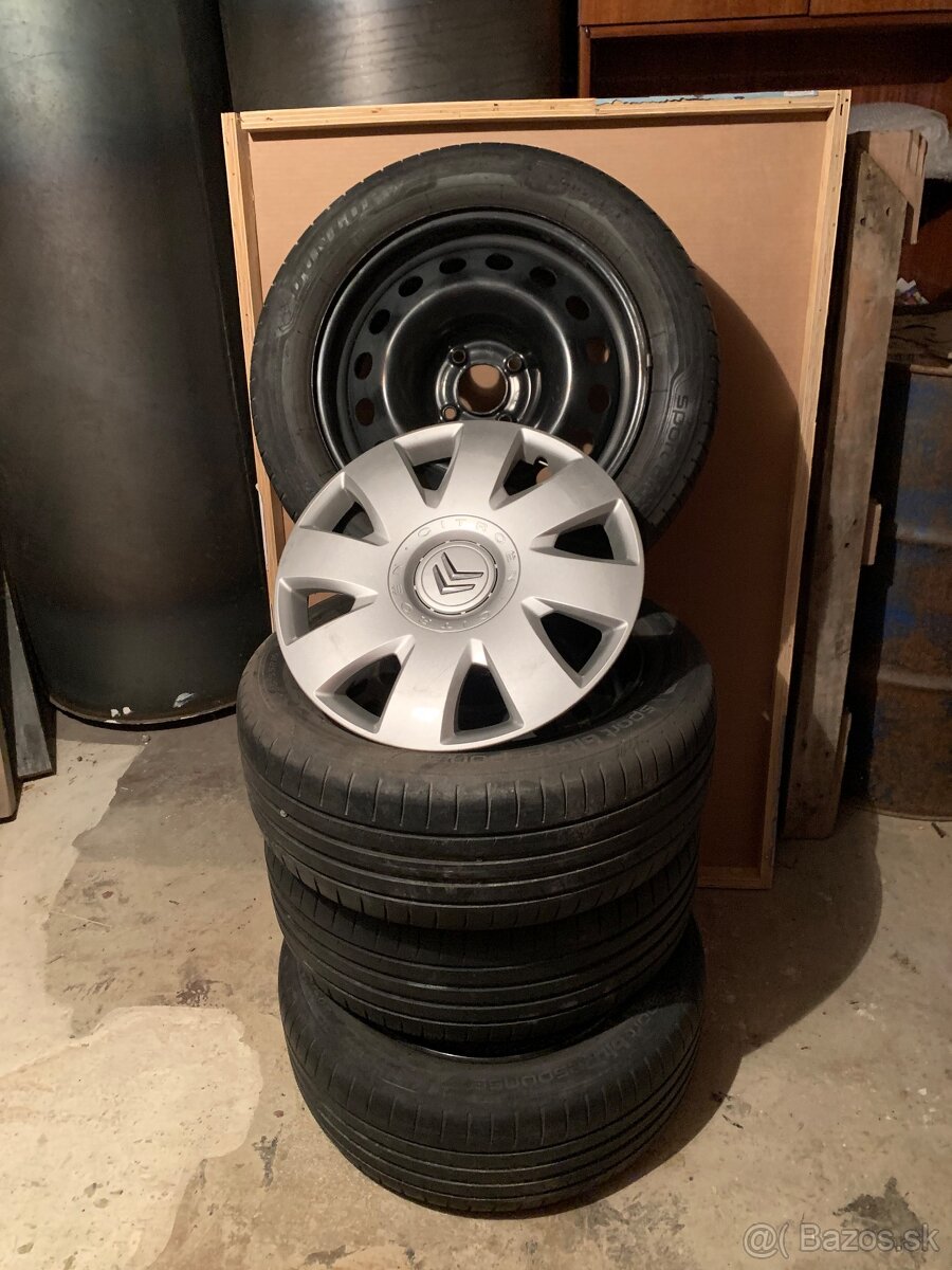 Predám letné pneumatiky Dunlop sport blu response 205/55 R 16, 4 ks na oceľových diskoch plus 4ks puklice že. Citroën, cena spolu 220€