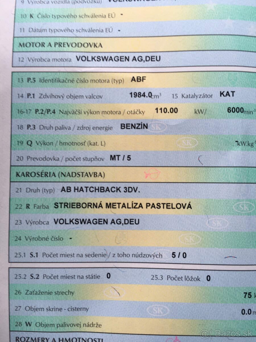 Predám noty+štítok na Golf mk3 2.0 GTI 16v 110kw.Kód motora ABF 3.dver.dočasne vyradené.
