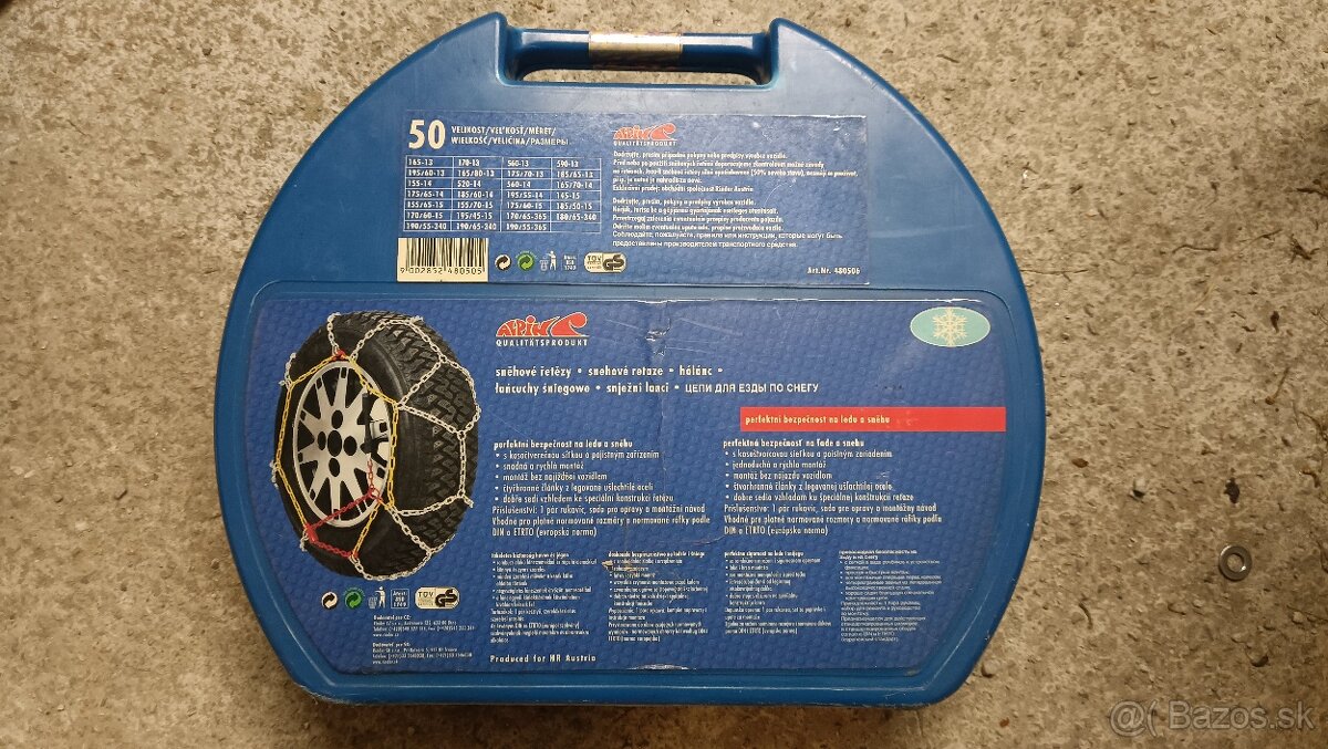 Predám snehové reťaze použité 2 krát. Jednoduchá a rýchla montáž. Štvorhranné články z legovanej ušľachtilej ocele.
